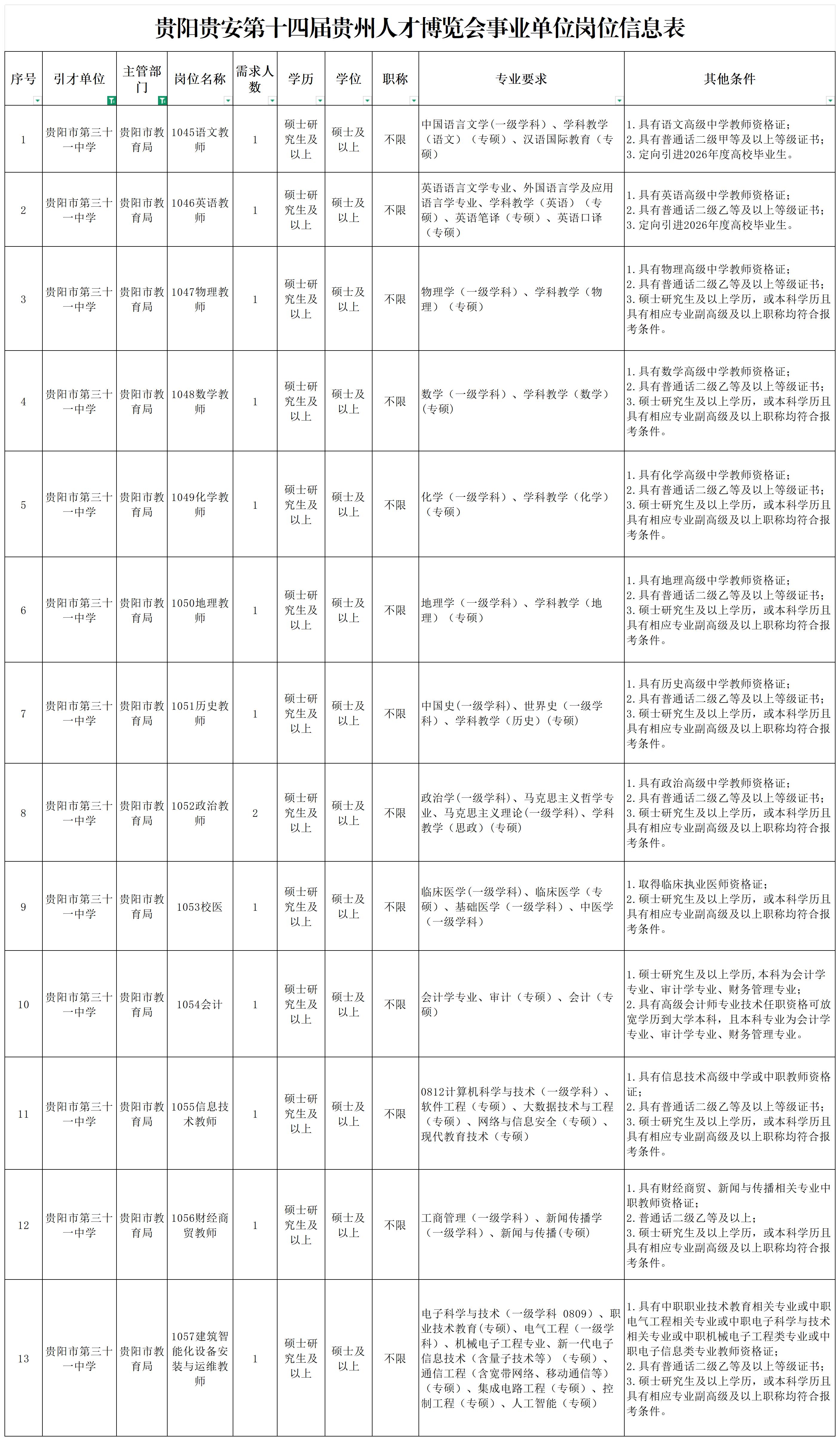 第十四届贵州人才博览会贵阳市第三十一中学(贵阳市经济贸易中等专业学校)引进高层次及急需紧缺人才公告